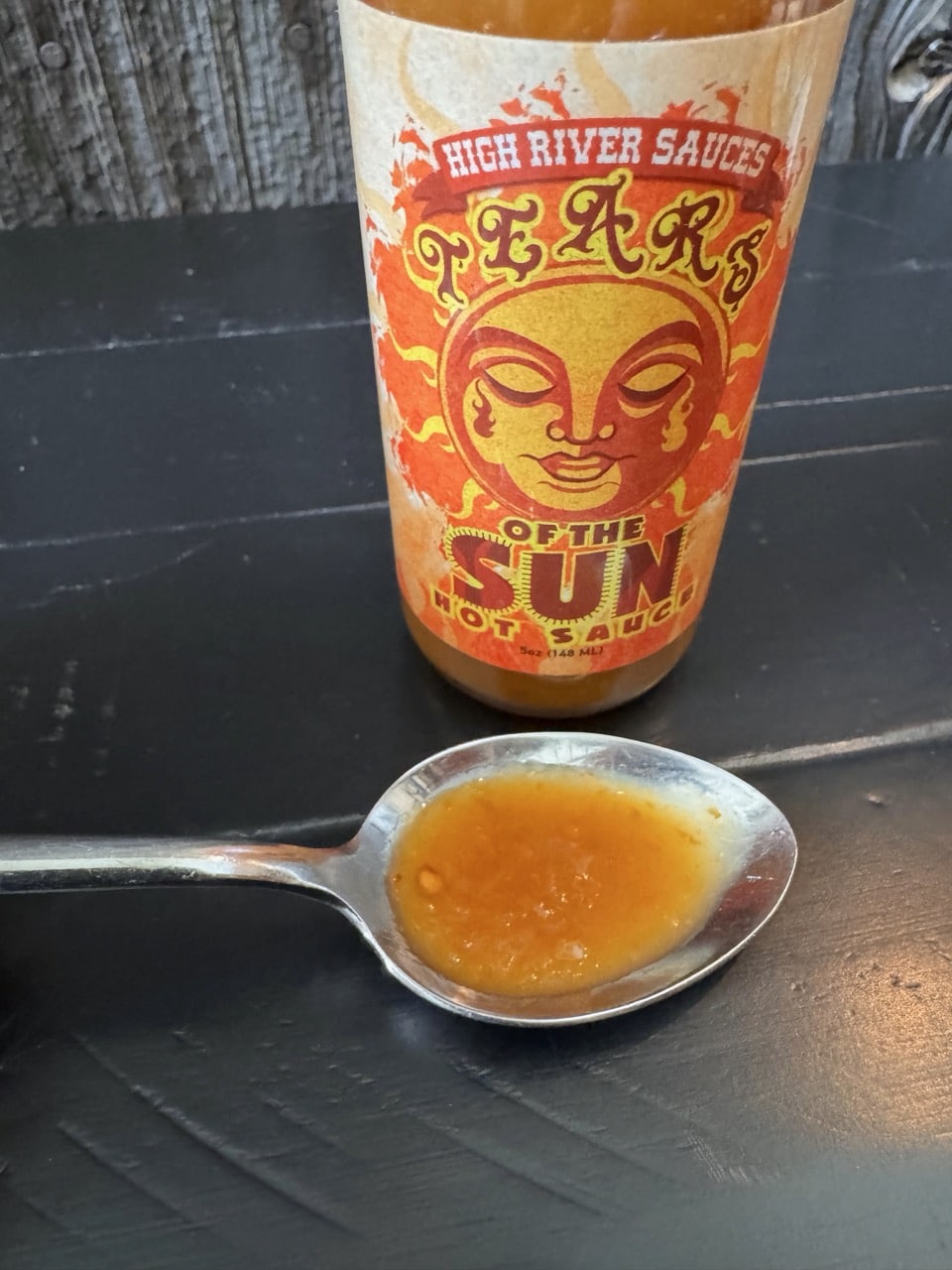 Tears of the Sun on a spoon. The hot sauce has enough body to stick close to where it’s placed.